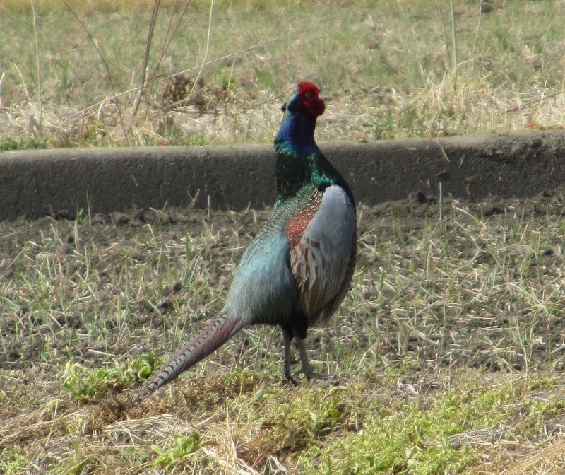 入間河川敷にキジがいるという話は、以前から聞いていたのですが、実際に見たのは初めてです。警戒心が強く、なかなか距離を近づけることができません。この画像も50mぐらいは距離が離れています。コンパクトデジカメの望遠端(400mmm相当)でかつそれをトリミングして強拡大しました。